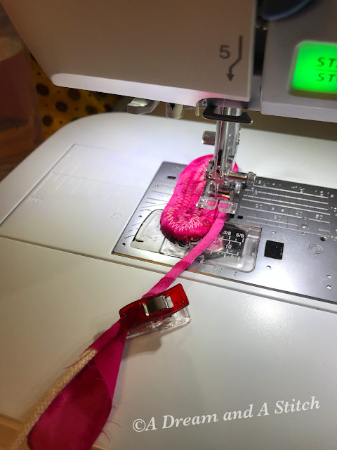 - Using your Purple Thang or chopstick, tuck the folded rope under your sewing foot in the shape you want your bowl. The one in the image is a short oval. If you want a circle, it is only a couple of stitches to start and you may want to wind a few rows.